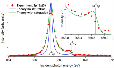 以氖原子中的近K吸收边RIXS过程为例,对于分立态的共振散射过程,例如|2p> → |1s-13p> → |2p-13p>过程,散射截面预期应呈现平滑对称共振曲线,但是实验观测到显著的非对称性,不同共振态间存在明显的串扰现象,特别是在|1s-14p>态共振能量区域,|2p-13p>散射强度出现急剧变化。针对这一新奇现象,研究团队发展了一套简洁而普适的离散量子态干涉理论,发现经由两个或更多分立激发态的激发-退激路径抵达同一终态时(例如经由|1s-13p>或|1s-14p>中间态至|2p-13p>终态),不同散射路径对应的量子振幅会发生相干叠加,使得散射截面形成显著的不对称线形,不对称参数由两个干涉通道的跃迁振幅相对大小与相位以及它们的能量差决定,理论结果与实验数据高度吻合。
