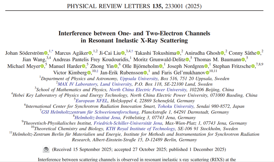 、欧洲XFEL等多个国际知名实验团队合作,在物理学领域顶级期刊Physical Review Letters上发表了《Interference between One- and Two-Electron Channels in Resonant Inelastic X-Ray Scattering》学术论文,刘纪彩教授为论文的共同通讯作者(理论工作),博士生王翦参与论文的计算模拟。
